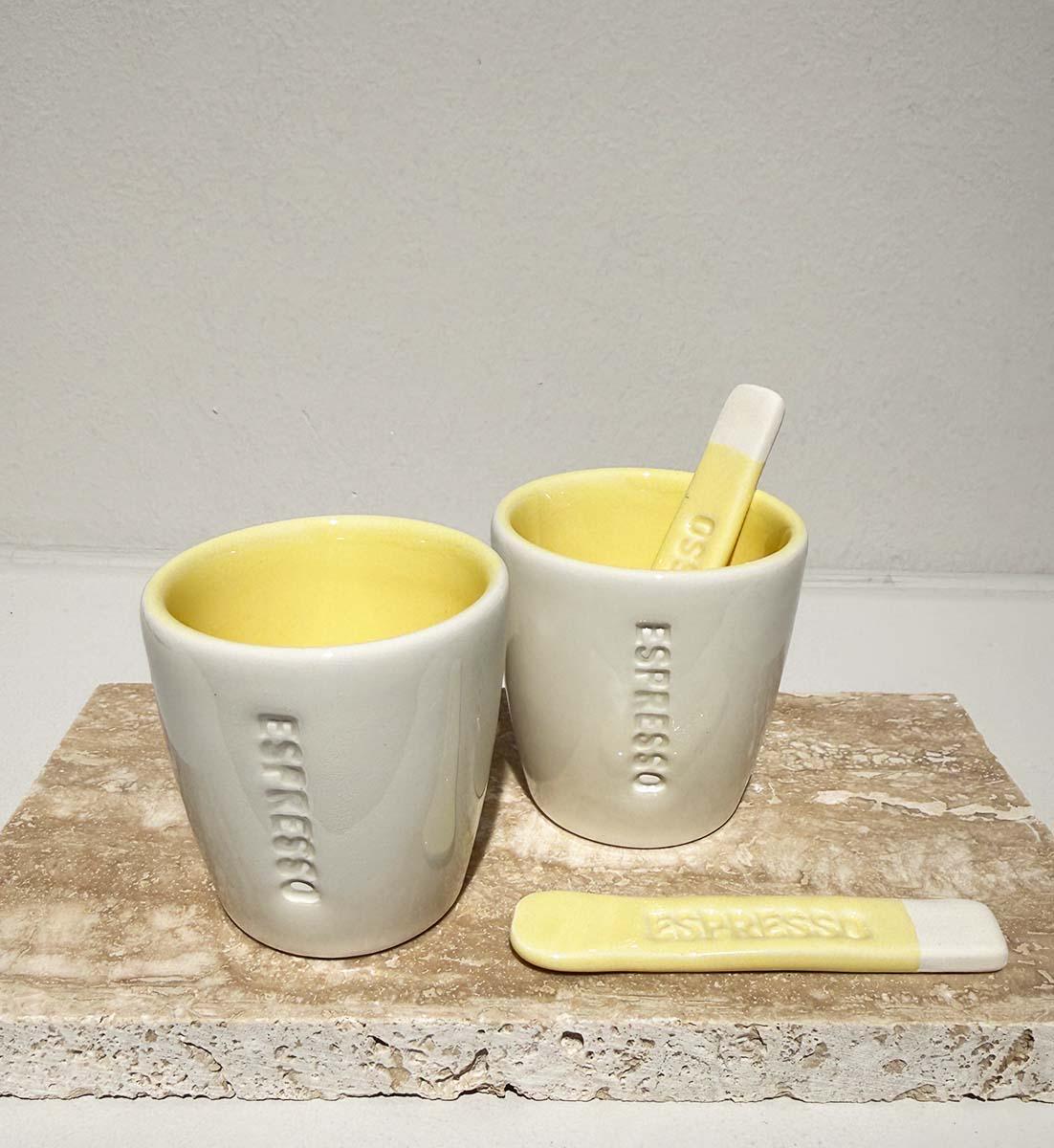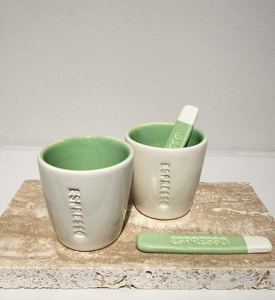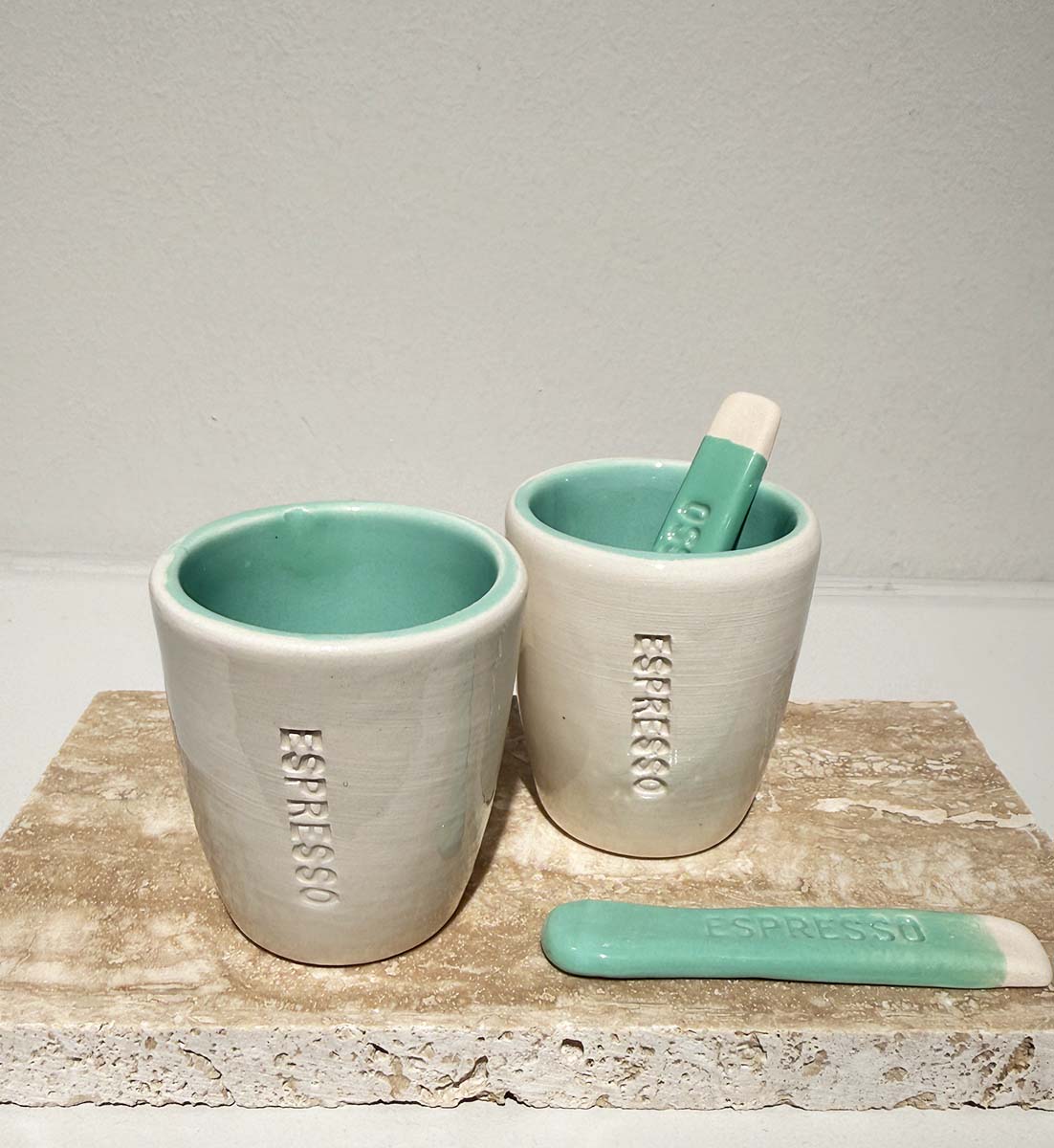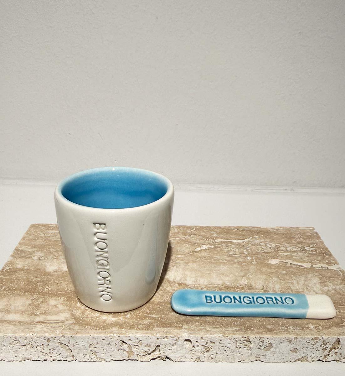 Eine farbenfrohe, henkellose Espresso-Tasse mit Keramiklöffel.