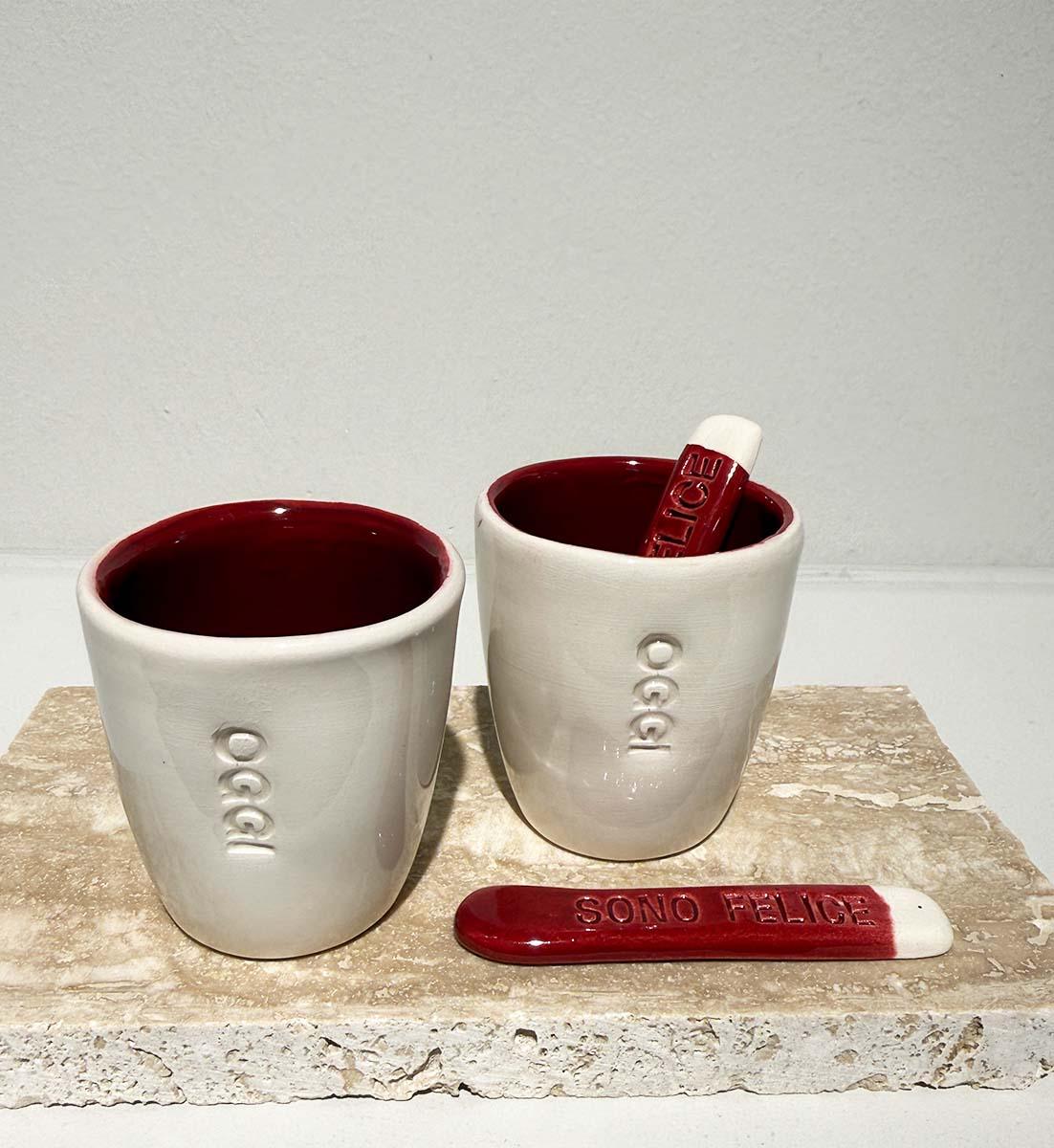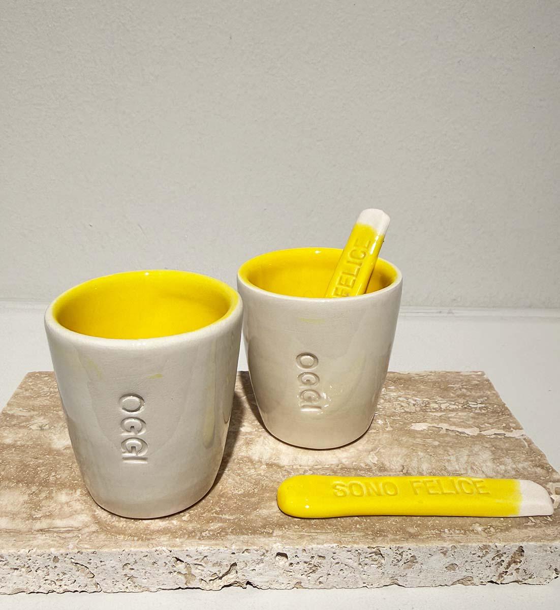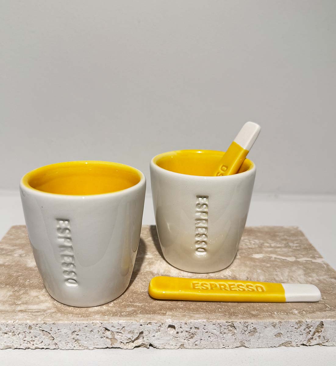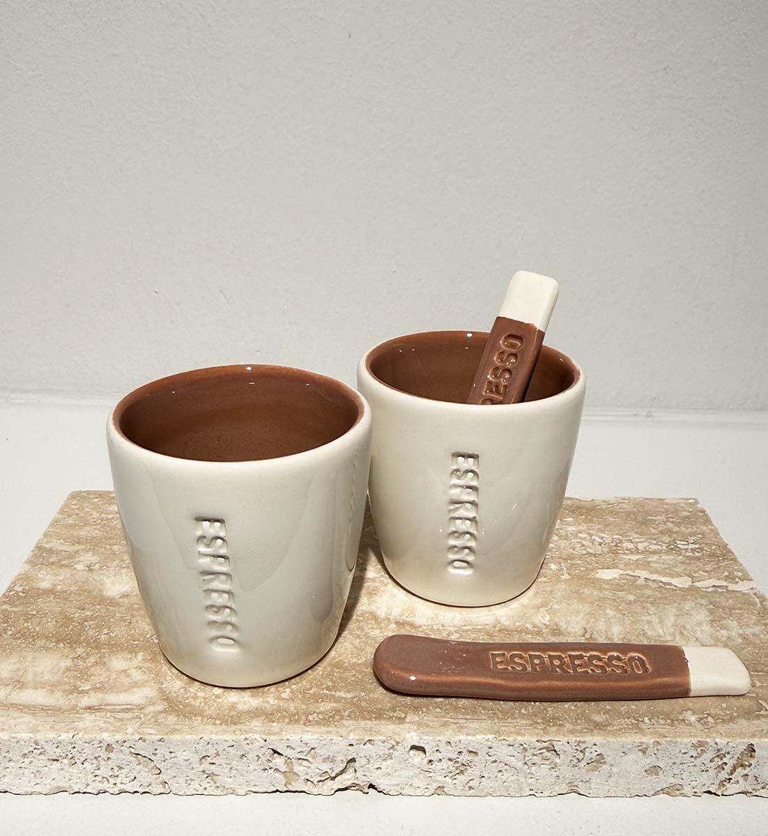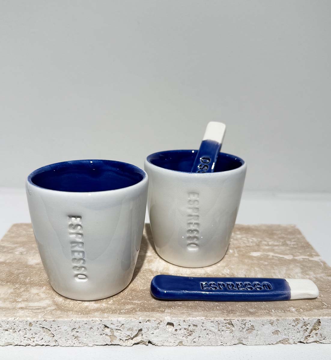 Eine farbenfrohe, henkellose Espresso-Tasse mit Keramiklöffel.