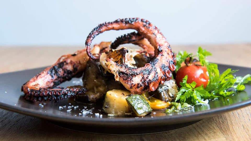 5. Währenddessen Gemüse nacheinander in einer Pfanne mit heissem Öl (ca. 3 EL) goldbraun anbraten. Als Erstes Paprika, dann Zucchini und Artischockenherzen. Gemüse sollte gar sein, aber noch Biss haben. Salzen, pfeffern, dann auf Tellern anrichten, gegrillten Tintenfisch darauf anrichten und mit der Vinaigrette beträufelt servieren.