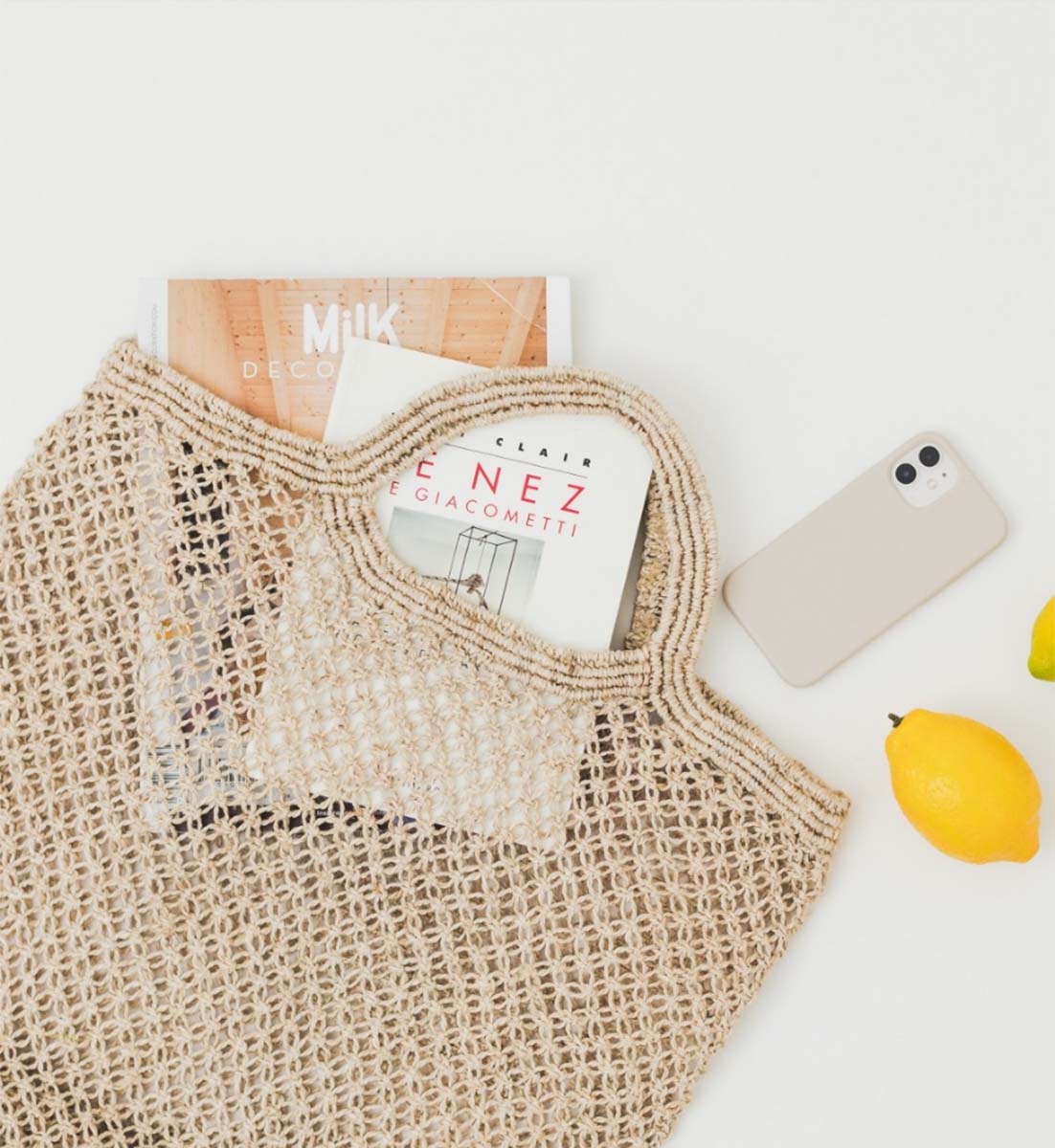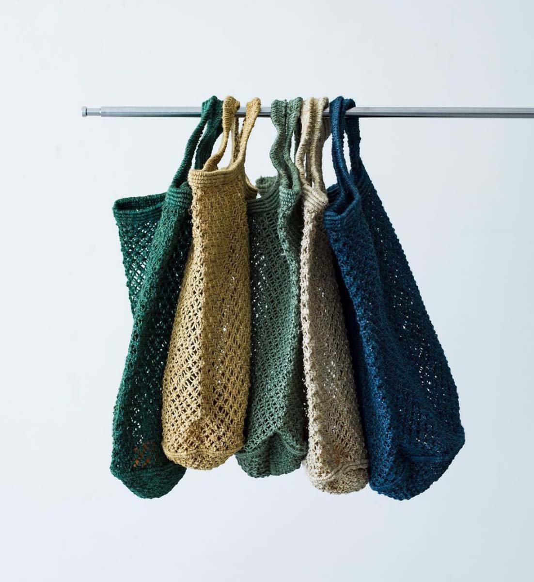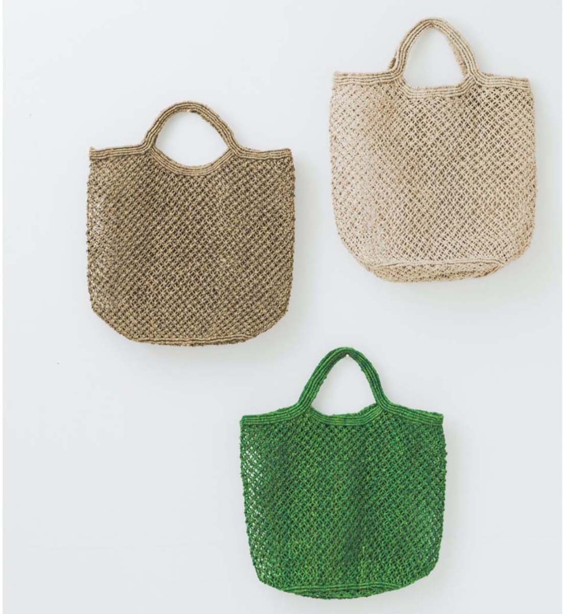 Elegante und leichte Makramee-Einkaufstasche aus Jute, die vollständig aus handgeknotetem Jutefaden besteht.