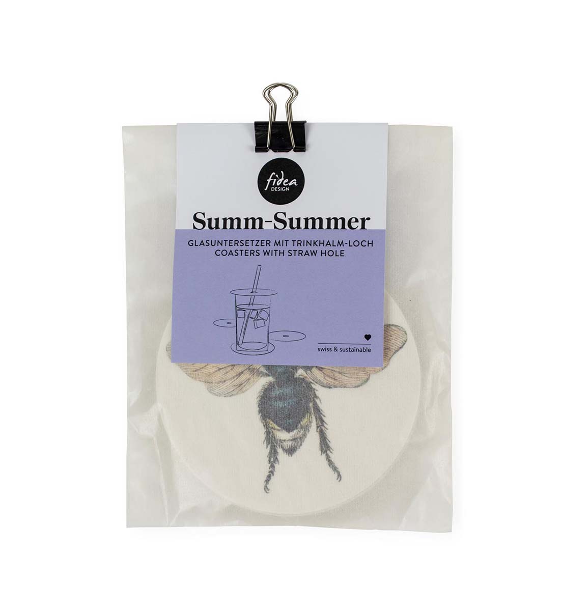Summ-Summer ist sowohl als Untersetzer als auch zum Abdecken von Gläsern geeignet. Dank des Strohhalmlochs können Sie kühle Erfrischungen geniessen, ohne sie mit Insekten zu teilen.