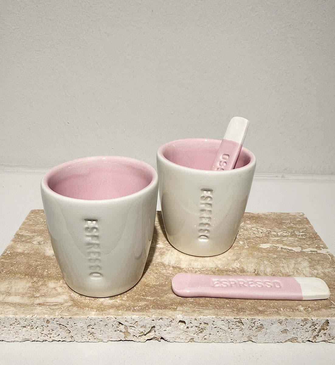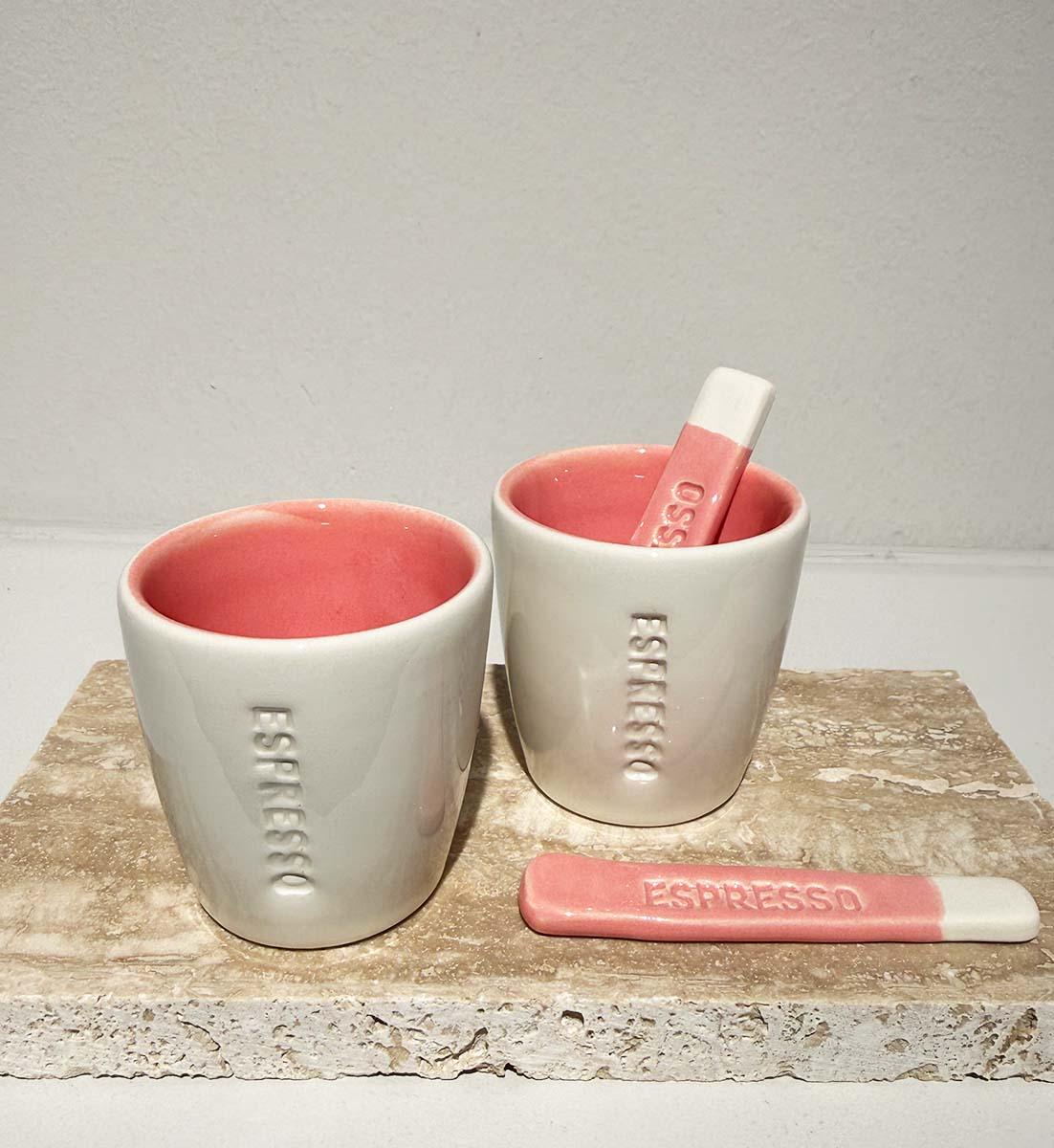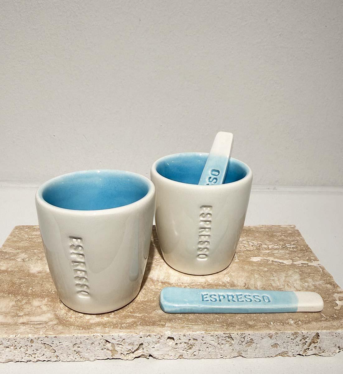 Eine farbenfrohe, henkellose Espresso-Tasse mit Keramiklöffel.