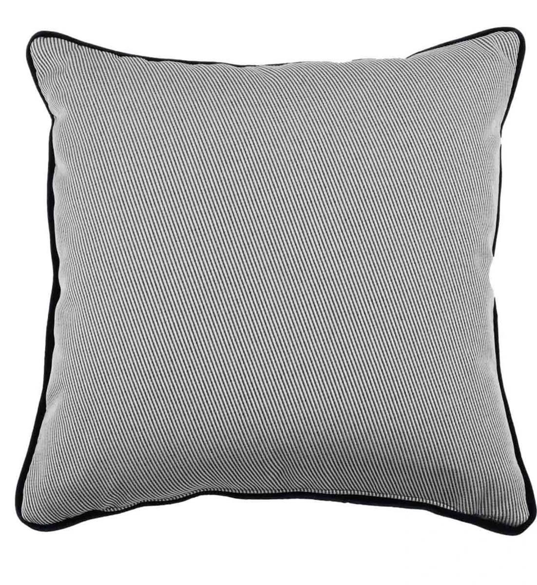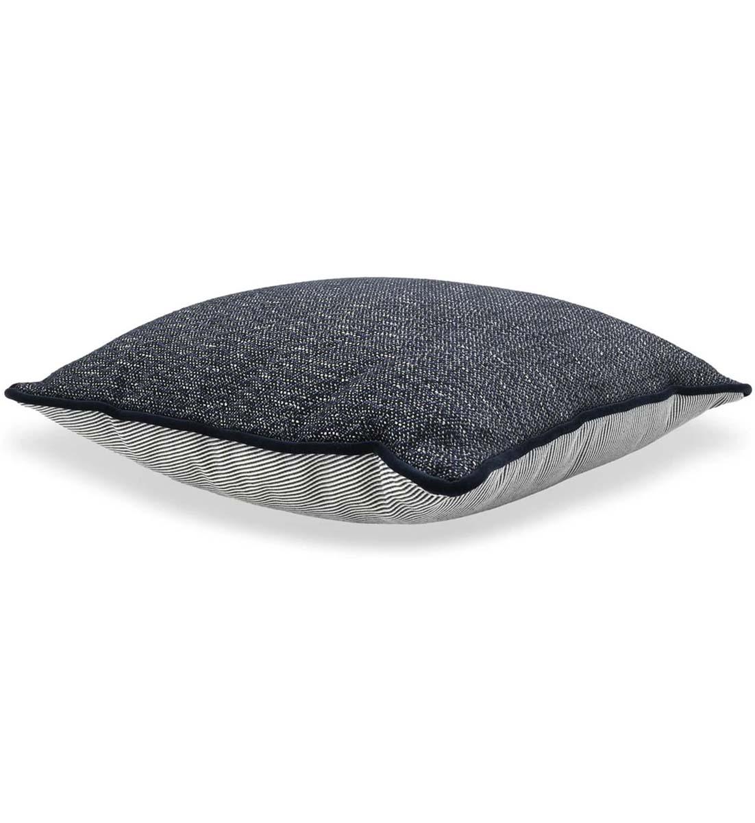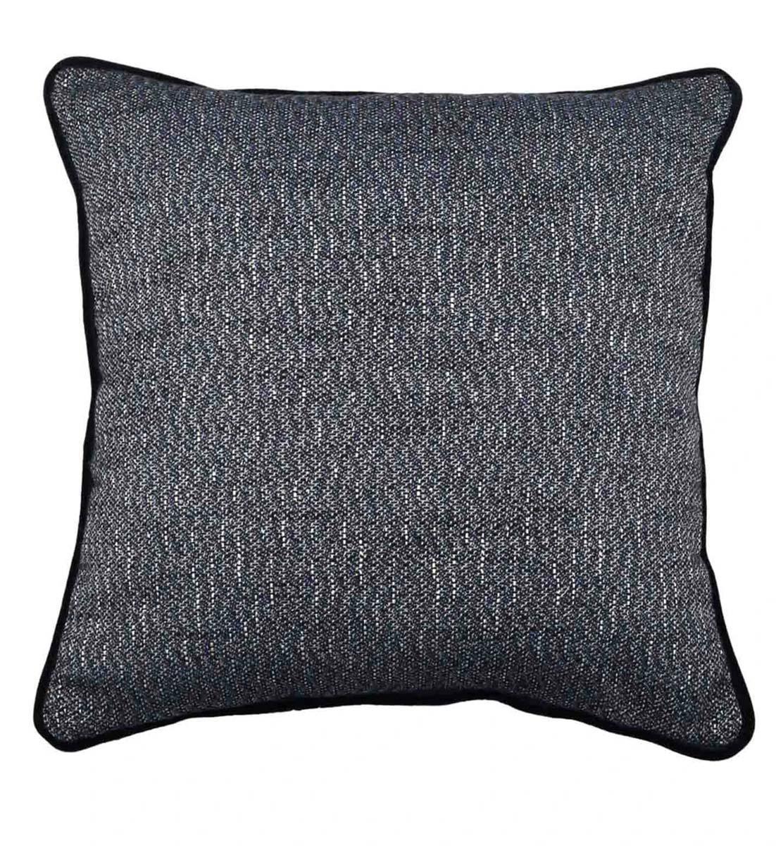 Quadratisches Kissen aus feinem blauen und schwarzen Jacquard-Stoff mit gemustertem und weicher Baumwollsamt-Paspelierung, ein raffinierter Akzent für jedes sommerliche Ambiente.
