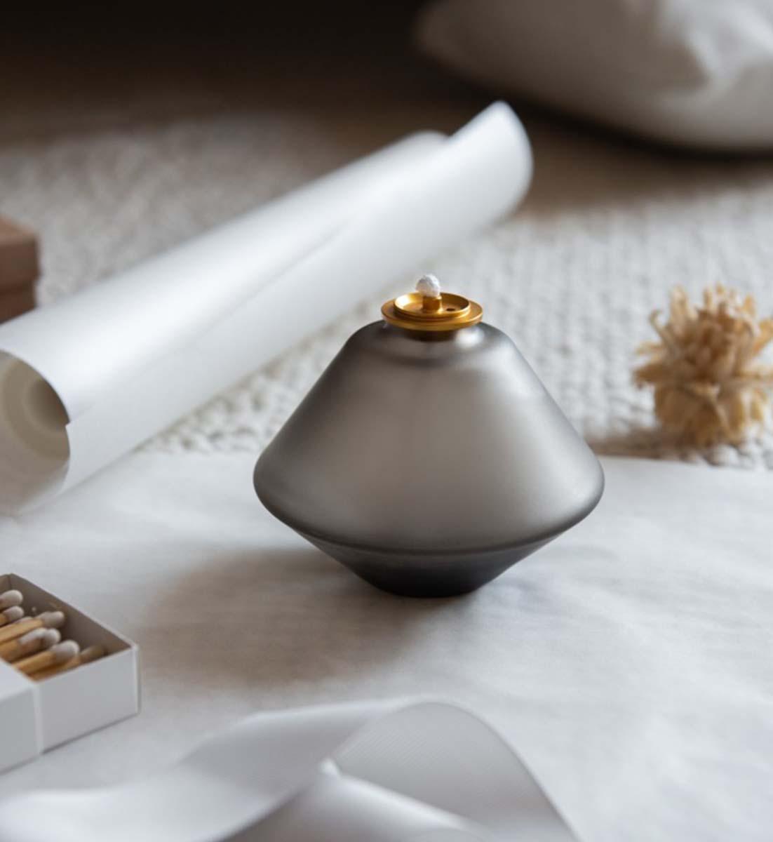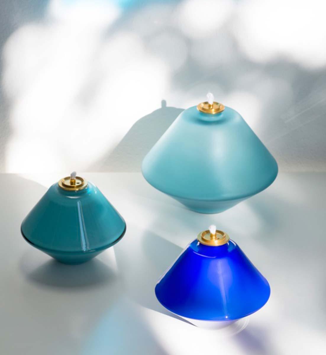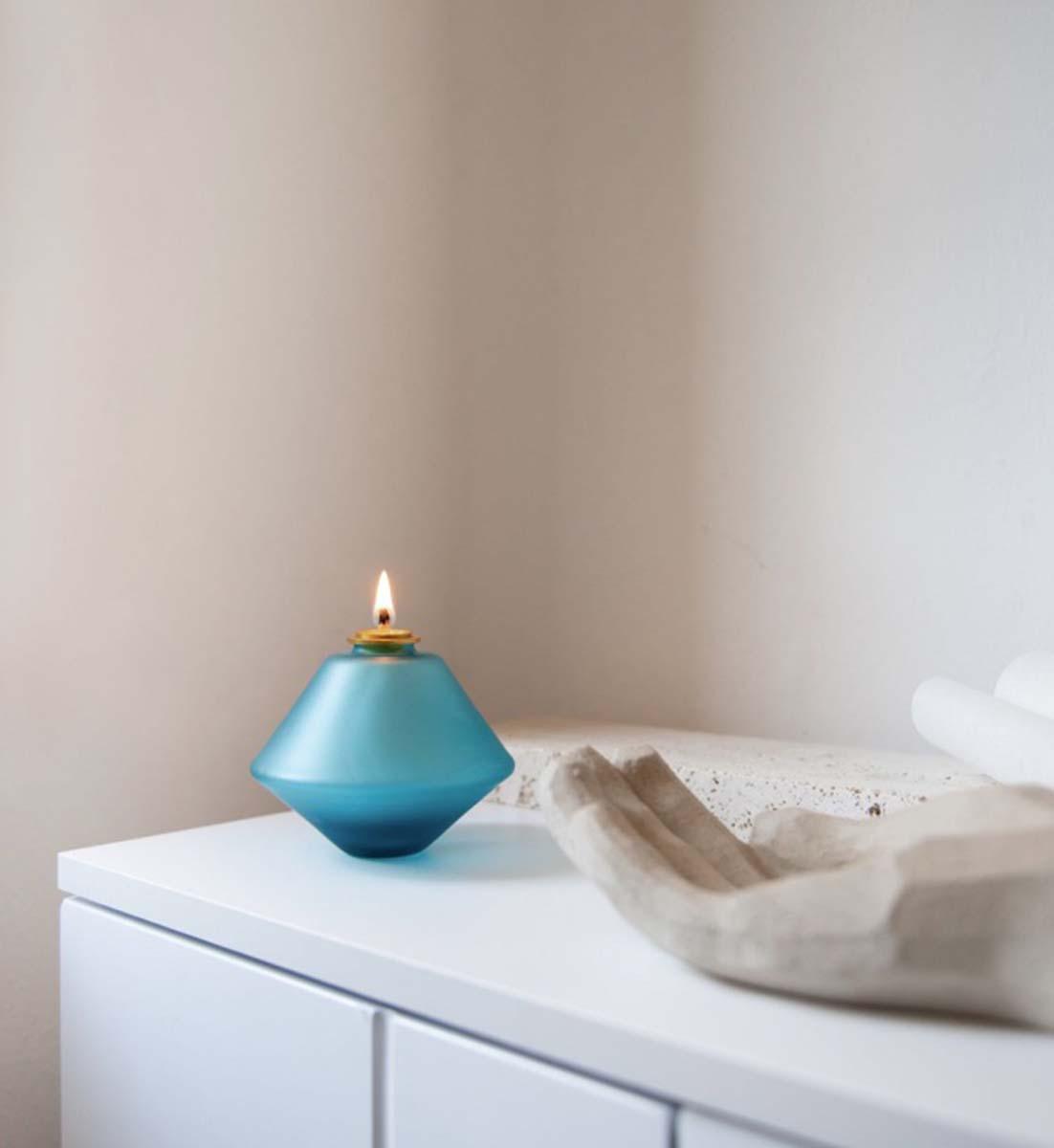 Diese gläserne Öllampe ist eine moderne Interpretation eines antiken Gefässes kombiniert mit einer modernen, geometrischen Form in reinen und schimmernden Farben.