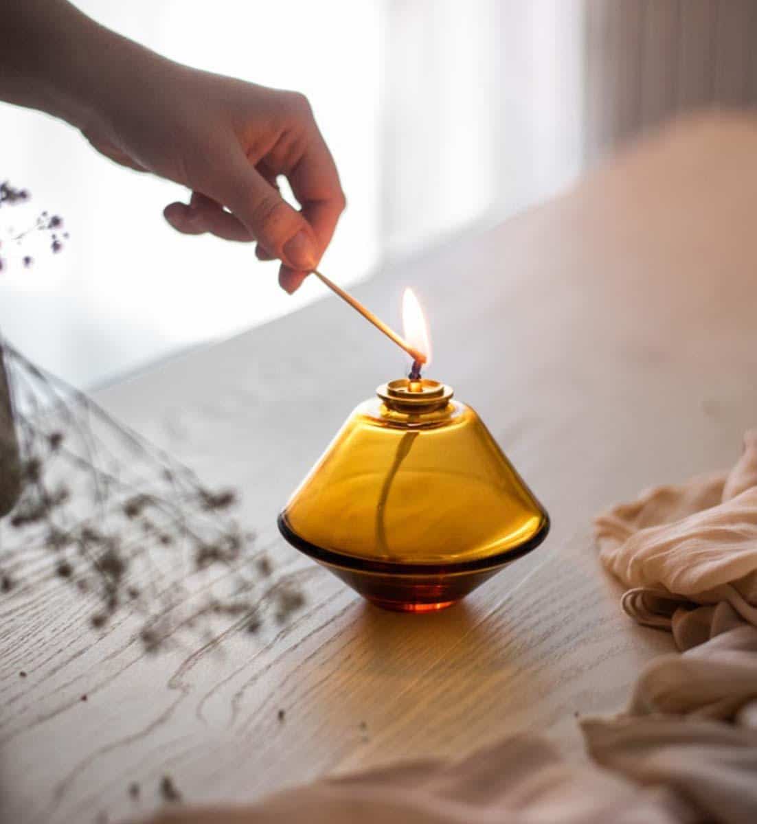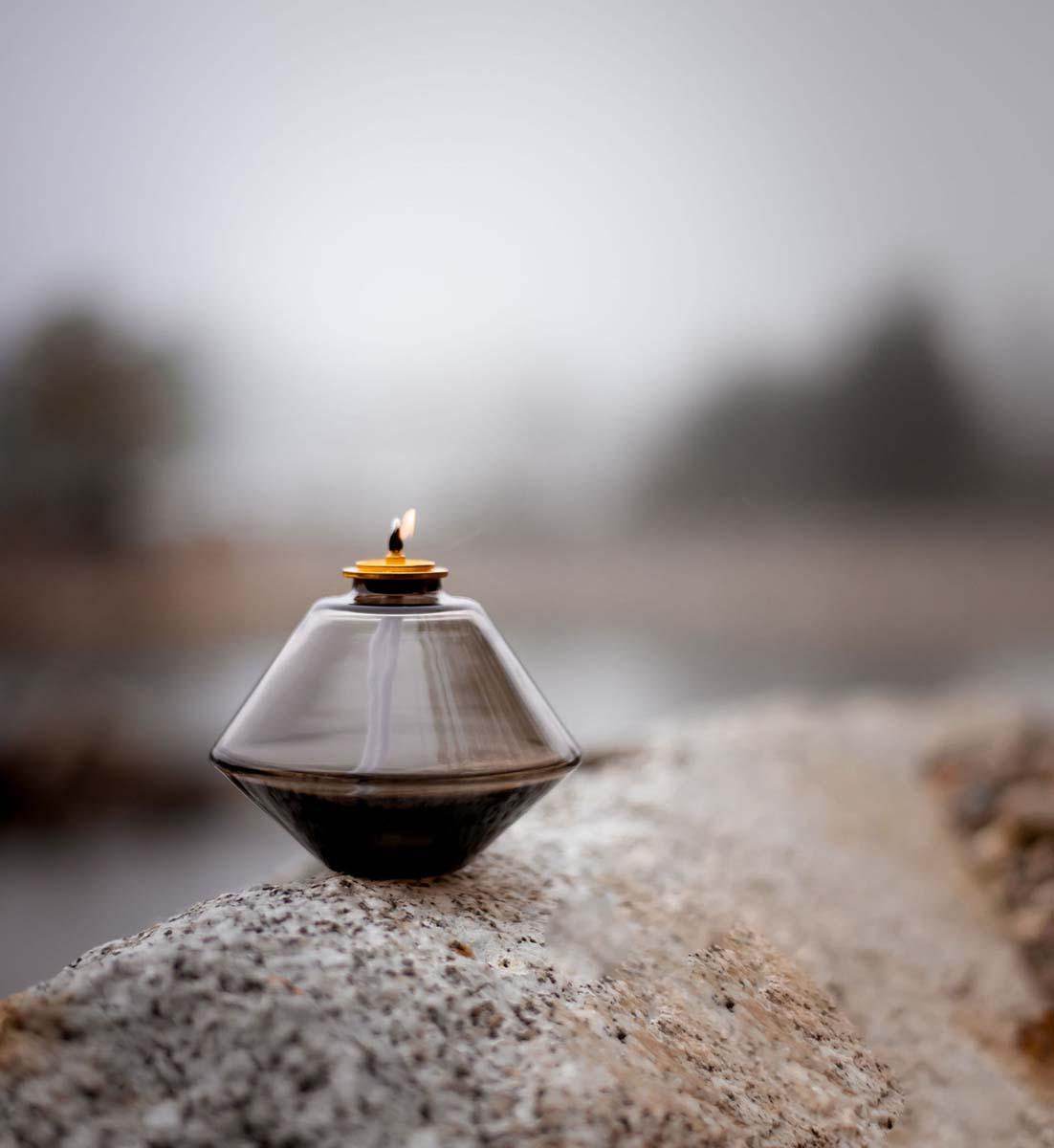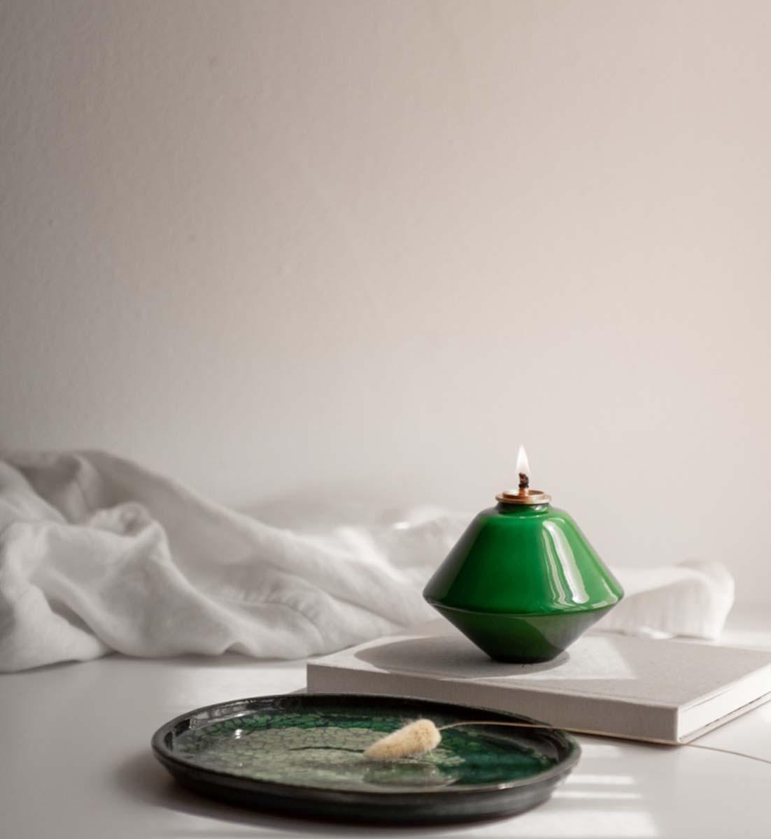 Diese gläserne Öllampe ist eine moderne Interpretation eines antiken Gefässes kombiniert mit einer modernen, geometrischen Form in reinen und schimmernden Farben.