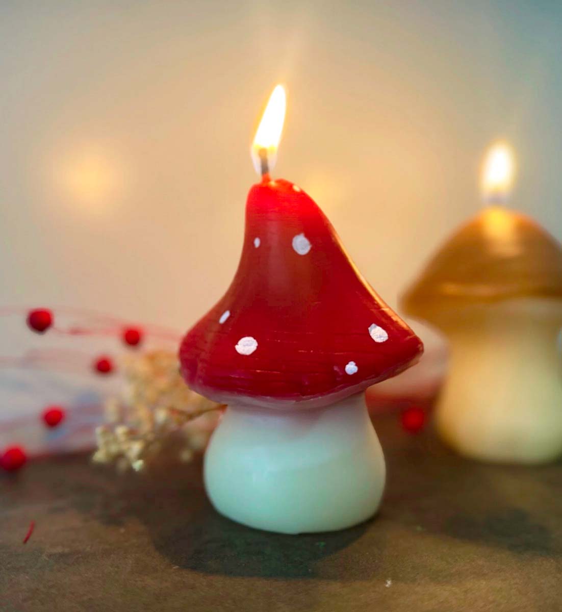 Diese charmanten Fliegenpilz-Kerzen aus naturreinem Bienenwachs bringen herbstliche und festliche Stimmung in jedes Zuhause.